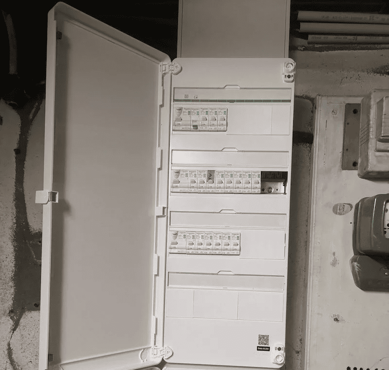 Remise à niveau de l’installation électrique dans une maison de ville avec suppression de l’ancien tableau vétuste, remplacement par un tableau moderne conforme aux normes en vigueur et équipé de disjoncteurs différentiels pour une sécurité optimale, raccordement des circuits existants, vérification des protections et adaptation des lignes si nécessaire, mise aux normes complète de l’installation et amélioration du système de distribution électrique afin de garantir fiabilité et sécurité.